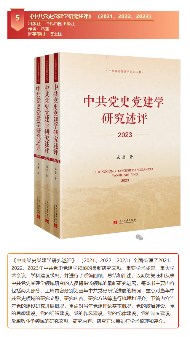 《中共党史党建学研究述评》 (2021、2022、2023)全面梳理了2021、2022、2023年中共党史党建学领域的最新研究文献、重要学术成果、重大学术会议、学科建设状况,并进行了系统回顾、总结和评述,以期为关注和从事中共党史党建学领域研究的人员提供该领域的最新研究进展。每本书包括两大部分,上篇内容为当年中共党史研究进展的概况,重点对当年中共党史领域的研究文献、研究内容、研究方法等进行梳理和评介;下篇内容为当年党的建设研究进展概况,重点对当年党建理论基本概况、党的政治建设、党的思想建设、党的组织建设、党的作风建设、党的纪律建设、党的制度建设、反腐败斗争领域的研究文献、研究内容、研究方法等进行学术梳理和评介。