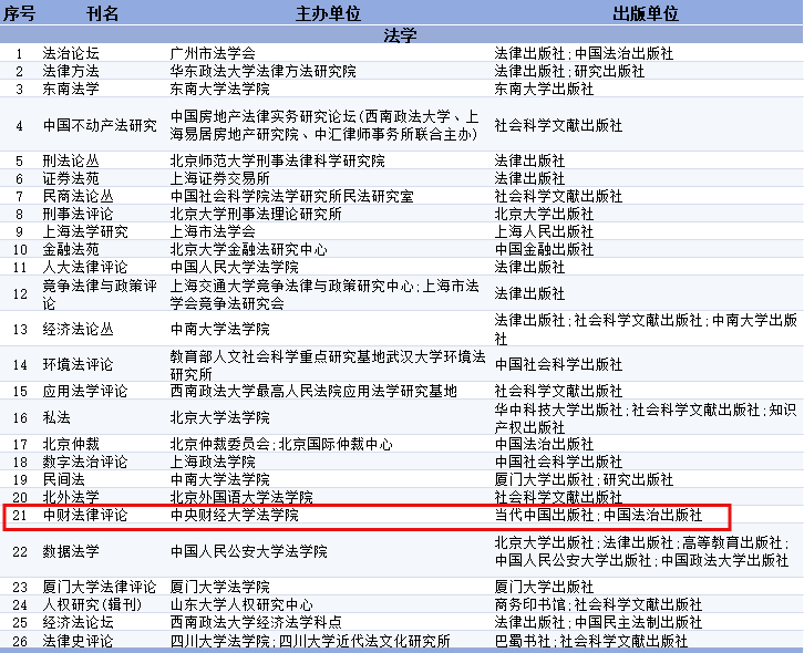 本次评价遵循定量分析与定性评估相结合的科学原则,以“影响力指数”为核心评价指标,综合考量被引频次、下载热度、学术质量、学科贡献等多重维度,对全国691种社科类学术辑刊进行全面评估。最终,评选出各学科排名前25%(Q1区)的191种高影响力辑刊。《中财法律评论》凭借突出的学术实力与影响力,成功入选法学类高影响力辑刊。