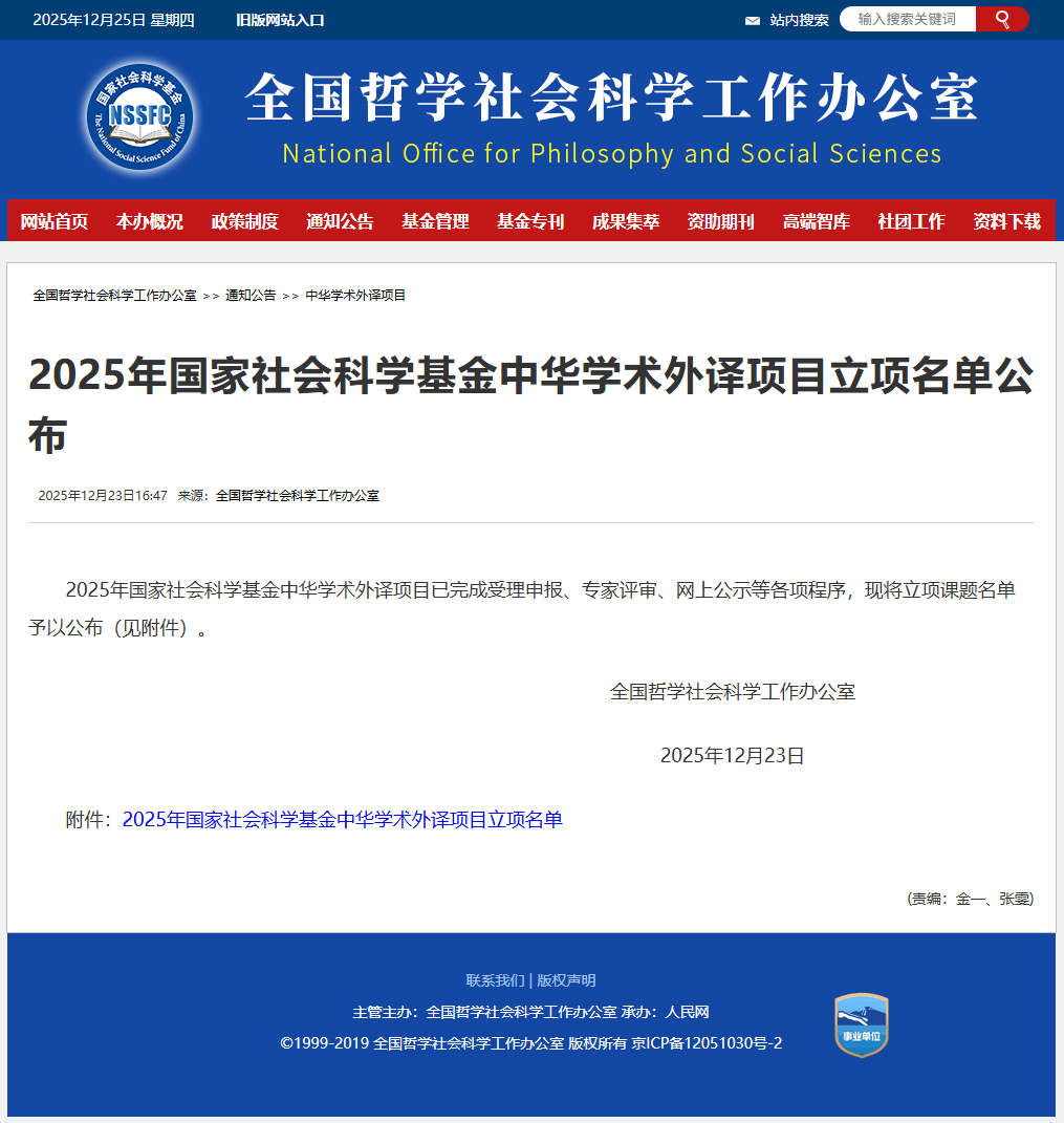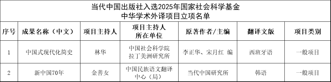 更多>>2025年12月23日,全国哲学社会科学工作办公室公布了2025年国家社会科学基金中华学术外译项目立项名单,当代中国出版社出版的《中国式现代化简史》《新中国70年》入选。