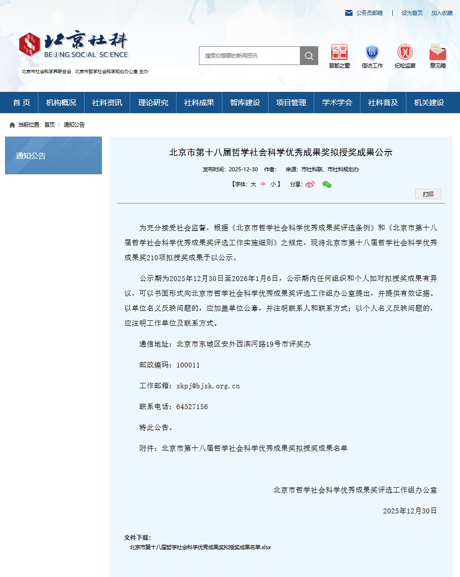 更多>>2025年12月30日,北京市哲学社会科学优秀成果奖评选工作组办公室公示了“北京市第十八届哲学社会科学优秀成果奖”拟授奖成果名单。