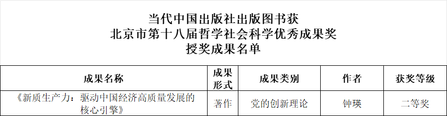 其中,当代中国出版社出版的《新质生产力:驱动中国经济高质量发展的核心引擎》获“党的创新理论”类别二等奖。